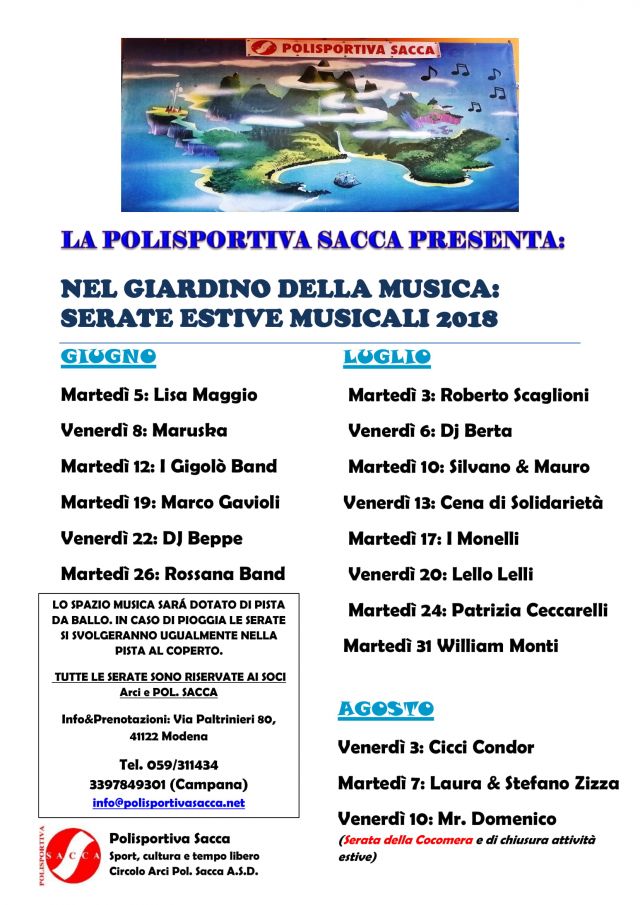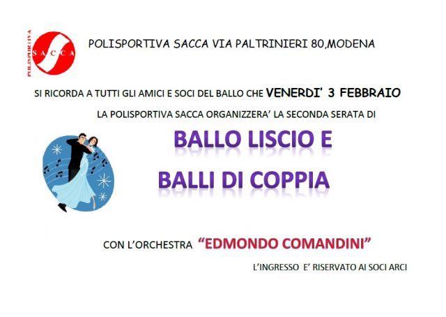 Tutti i Martedì (E siccome non ci stanchiamo mai anche qualche Venerdì) la Polisportiva Sacca vi invita nella nostra sala per ballare e divertirsi insieme con orchestre d'eccezione e bella musica!