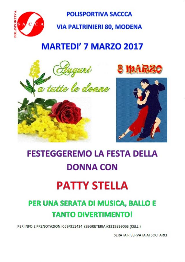 NON MANCATE ALL'APPUNTAMENTO DI MARTEDI' 7 MARZO CON PATTY STELLA PER FESTEGGIARE INSIEME LA FESTA DELLA DONNA!