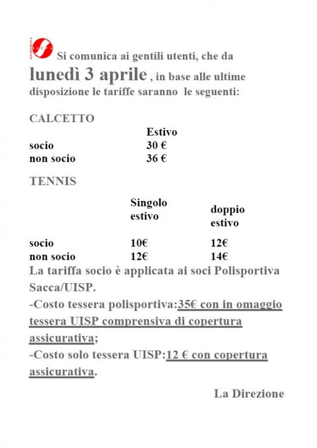 | Tariffe Estive Tennis/Calcetto 2017 | pubblicata: 30-03-2017 |