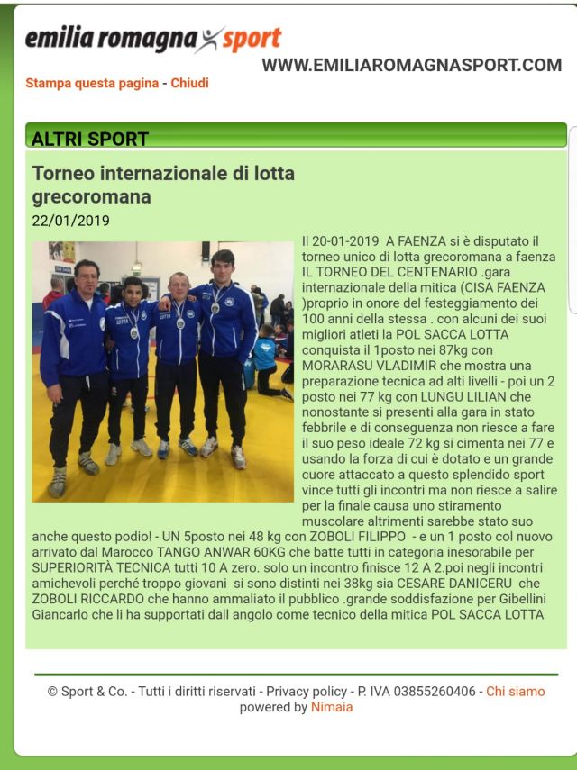 | Grande risultato degli atleti di lotta greco romana della Polisportiva al "Torneo del centenario". | pubblicata: 24-01-2019 |